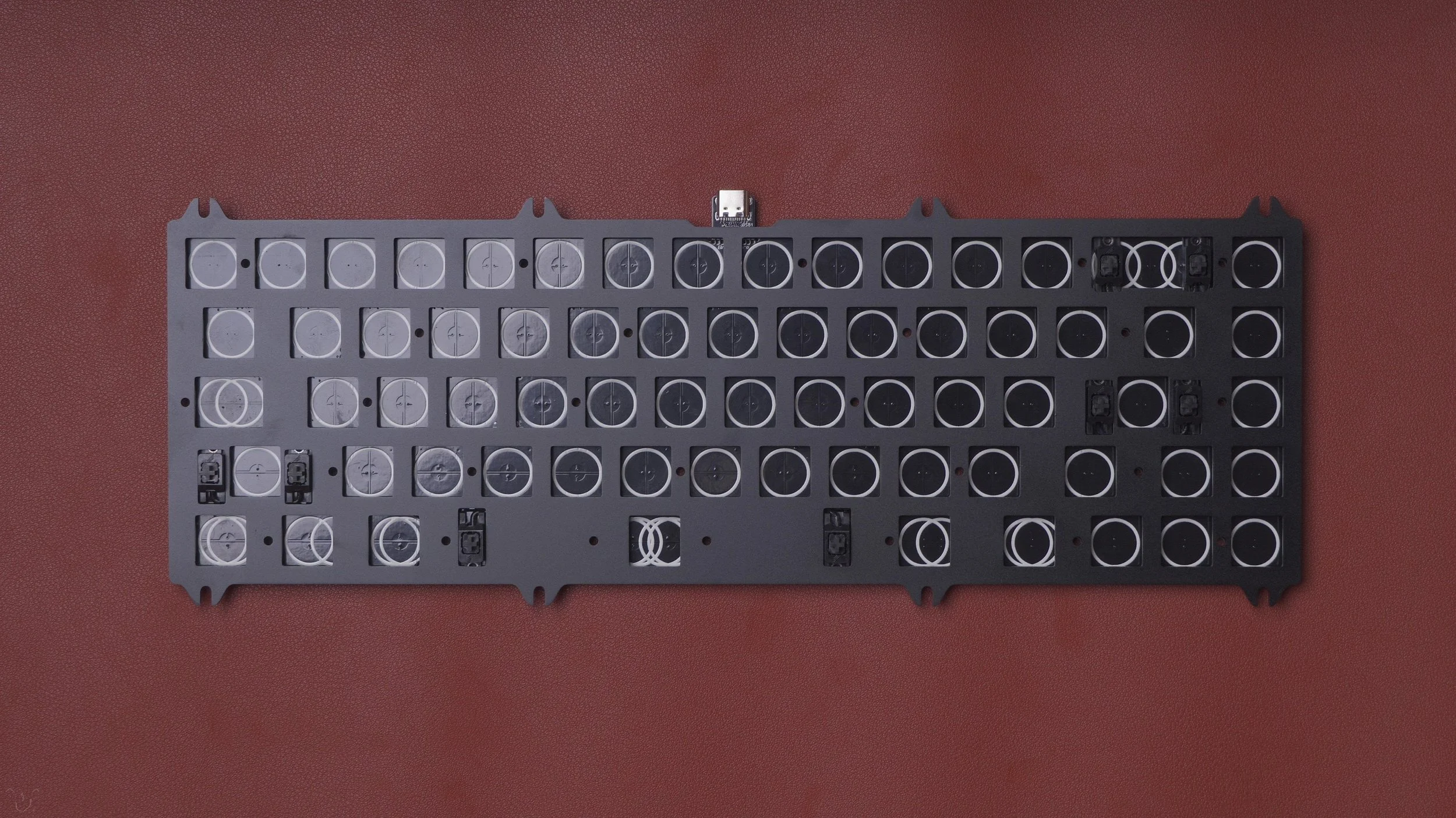 Depicted is a completed PCB-plate assembly with no switches. Your assembly should have: