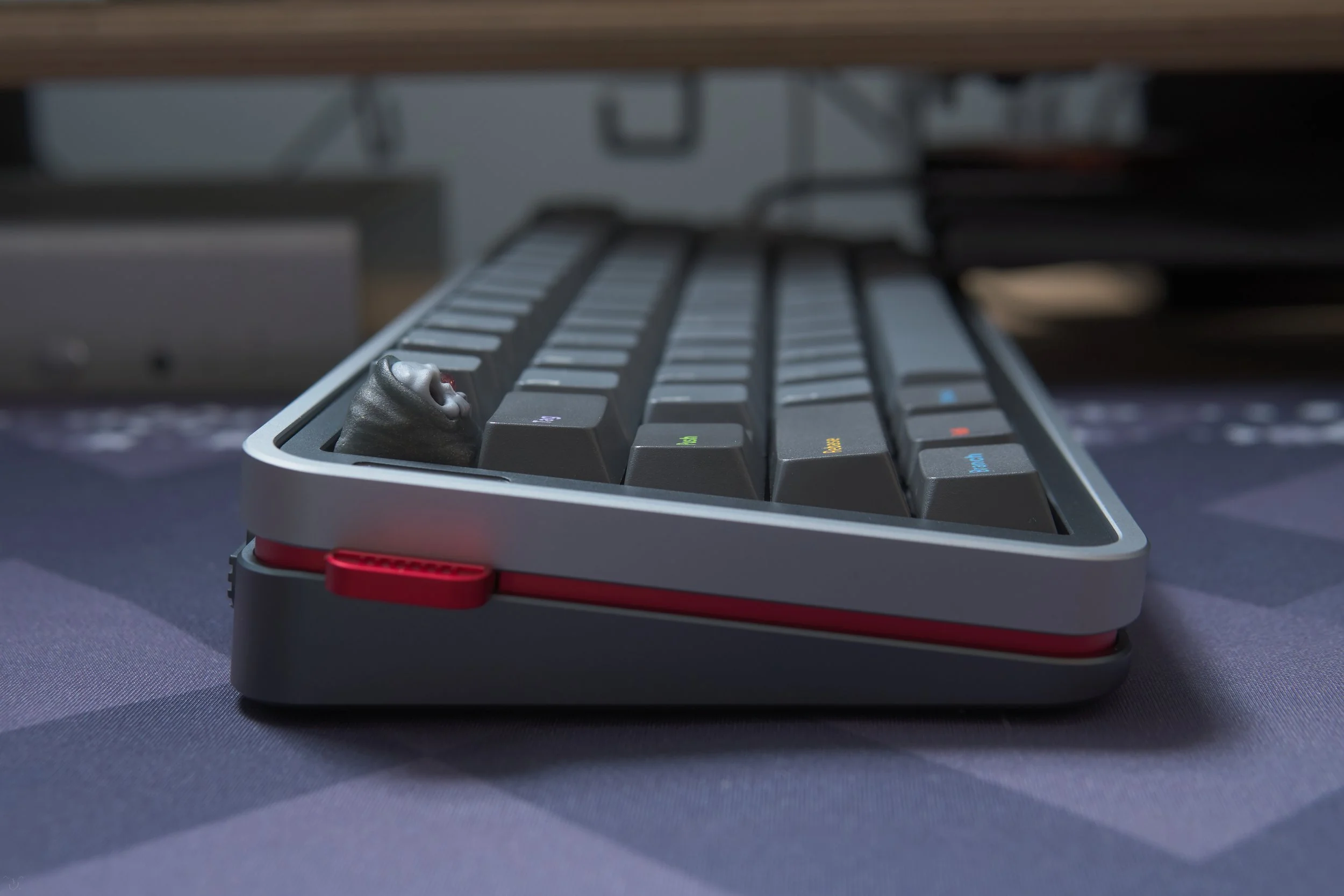 Grey-anodized aluminum case with red and blue side accents and PVD steel weight.