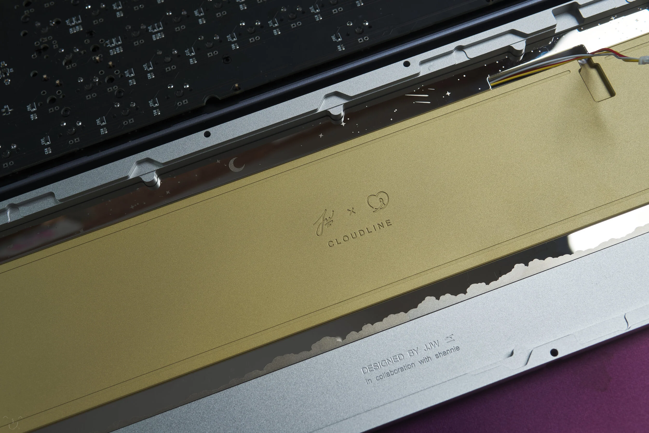 Prototype-exclusive bluish-grey-anodized aluminum case with brass weight and internal, engraved frame.