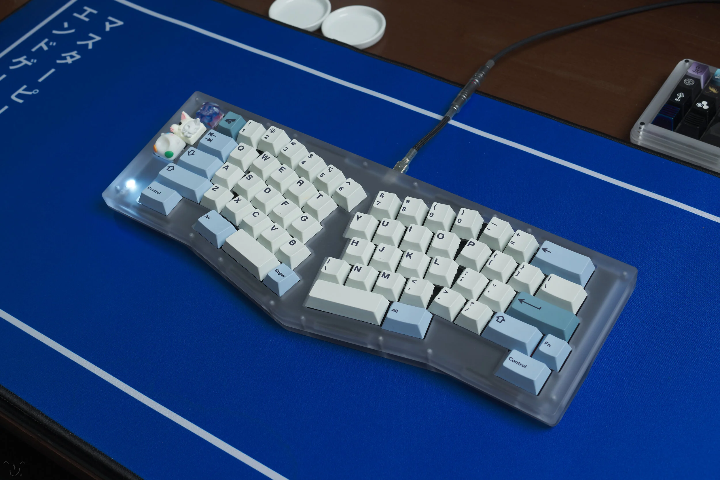 Lubed (205g0) JWK Lilac linear switches, with 62g springs and Deskeys films - mounted on an aluminum full plate.