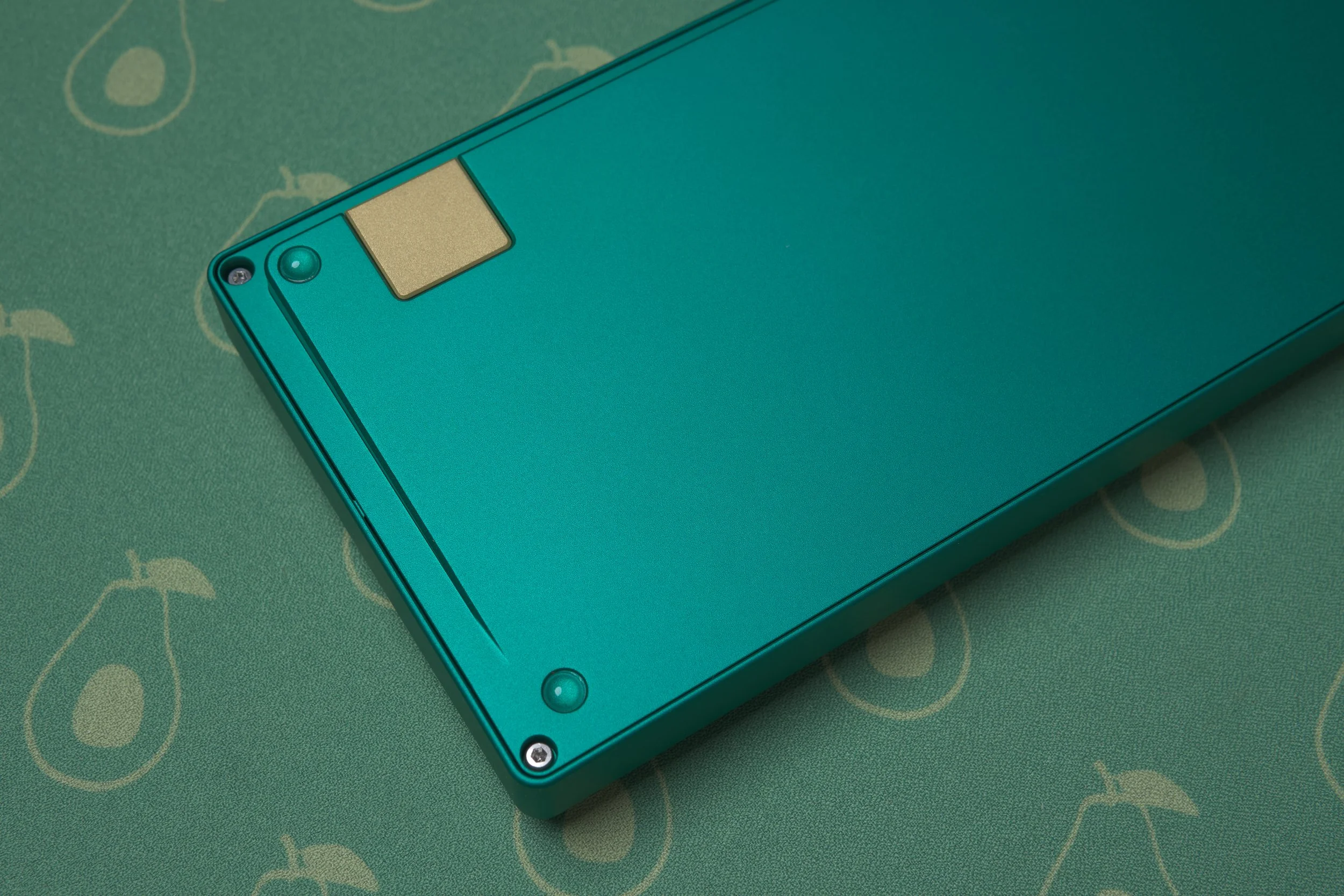 Green-anodized aluminum case with brass daughterboard badge.