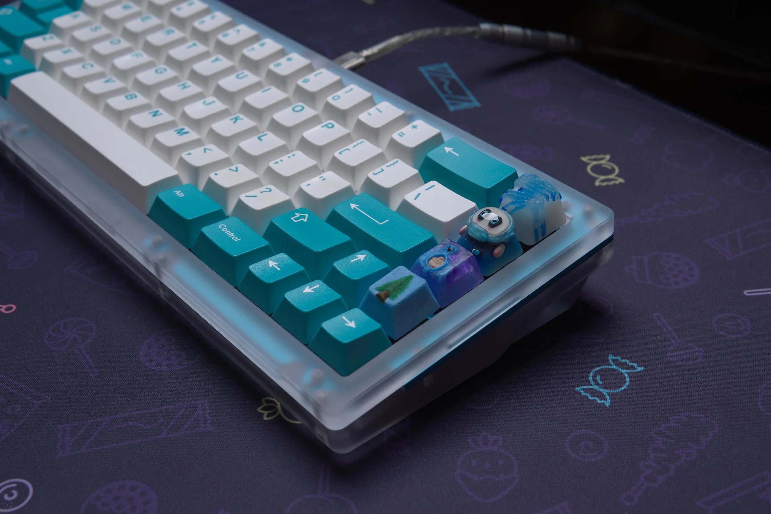 Frosted polycarbonate case with brass weight and cyan aluminum accents.