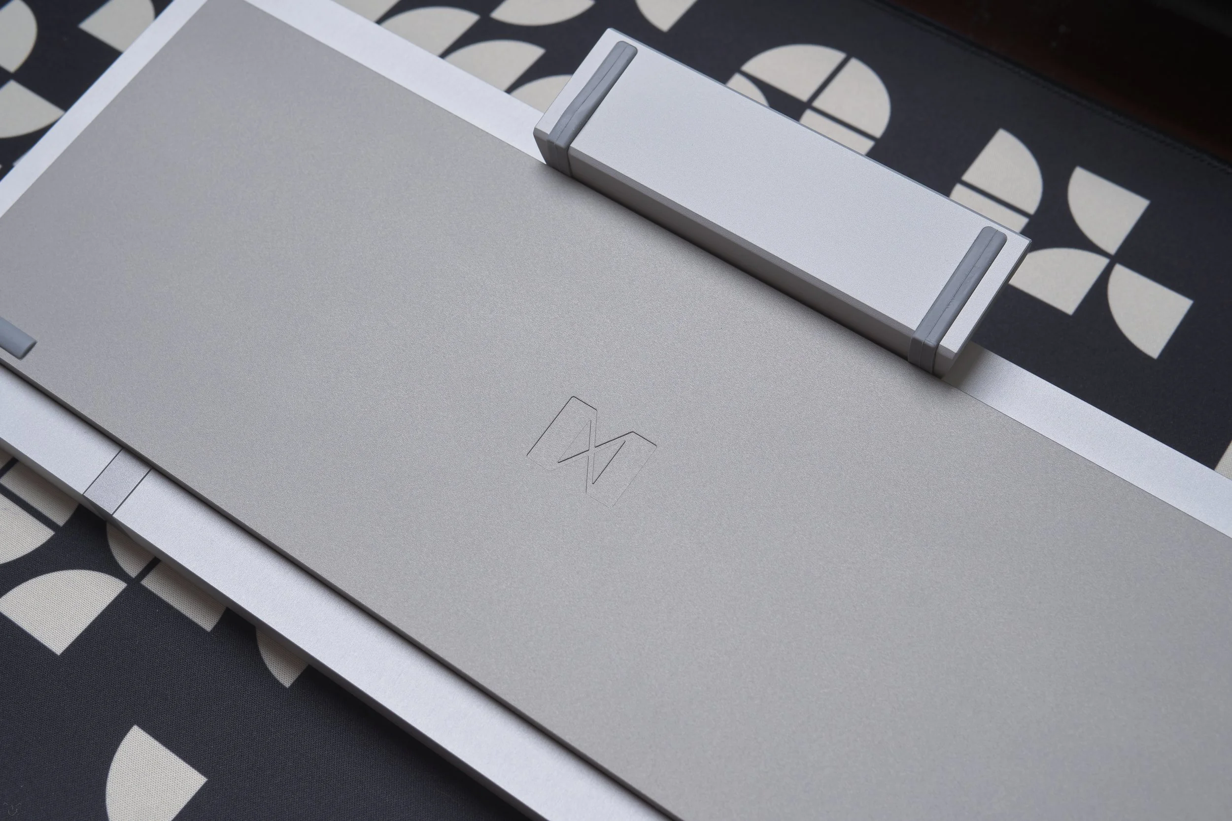 Light grey-anodized aluminum case with steel accent and darker grey anodized midpiece with sandstone finish.