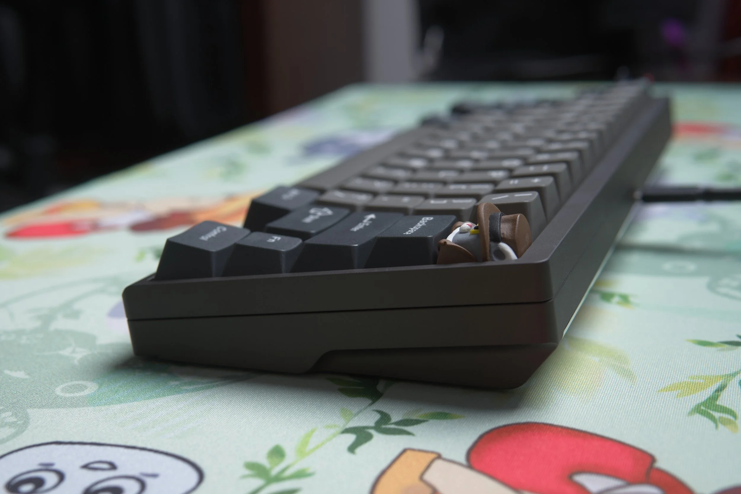 Cherry MX Black (ultraglide, broken-in) switches, lubed and with Deskeys filmed, mounted on an aluminum full plate.