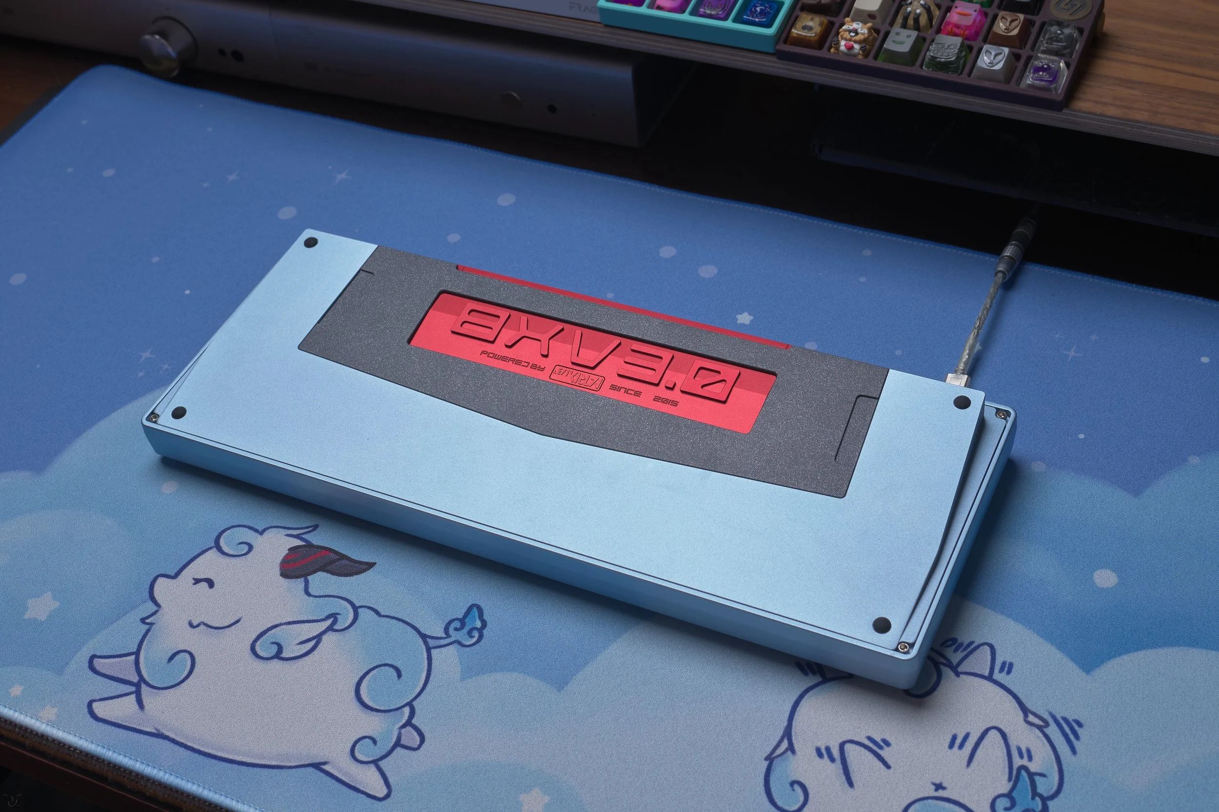 Light blue-anodized aluminum case with coated brass weight. Custom anodizing by Caustic Customs Anodizing.